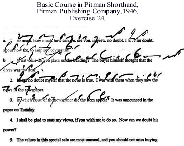 This self-dictation file is currently being offered FREE OF CHARGE if you'll just write to me with an e-mail address. Basic Course in Pitman Shorthand, 1946, was the text transcribed for these self-dictation sheets. Writers of any system can benefit from this material. There are 50 lessons in all and the material is graded. In other words, the vocabulary builds. Give them a try and see what you think.